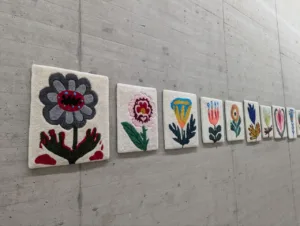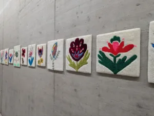 У Sofia Magdits Espinoza — полуабстрактные сотканные полотна, разбросанные нити бисера, бусин, ракушки, напоминающие ландшафты, поля, морской берег. Можно поучаствовать в создании нового объекта — клубки пряжи разбросаны рядом с ткацким станком, предлагается из зрителя стать соучастником и вплести свою часть в общее полотно.
