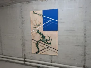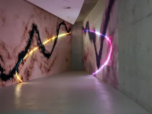 Вообще другой и по духу и по технике Erik Mikaia, создающий многометровые полотна стирая краску с ткани отбеливателем. Его работы абстрактные, графичные, звонкие и холодные; создающие на плоскости многомерное пространство. Художник всегда создает site-specific произведения. На сходящихся бетонных стенах в конце тоннеля два огромных (13х5м) полотна, посвященных Рейну (он всего в нескольких метрах от галереи). Размывы краски и неоновая подсветка изнутри. Свободное, своевольное движение и современный, техничный и точный город.