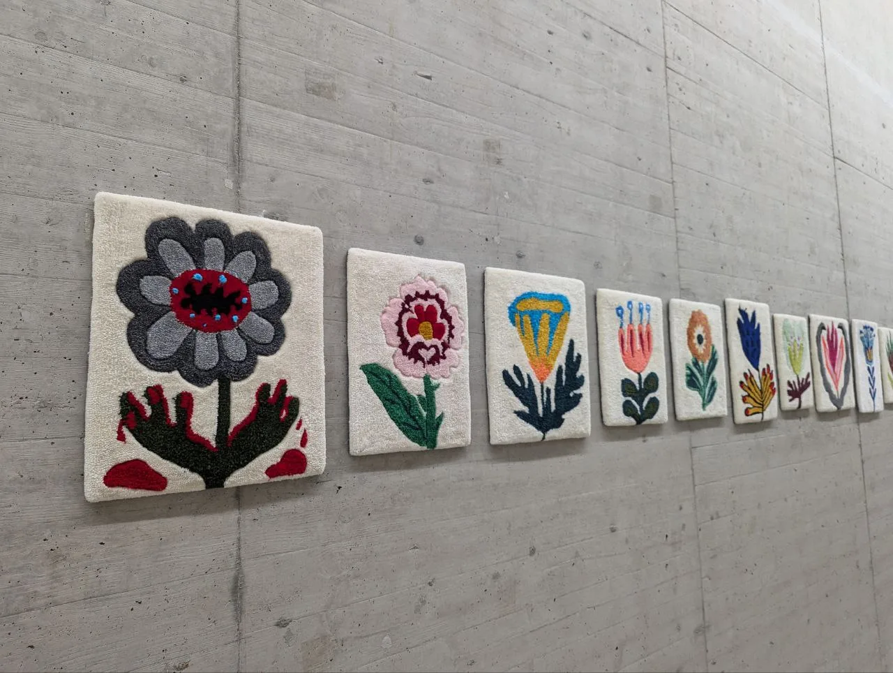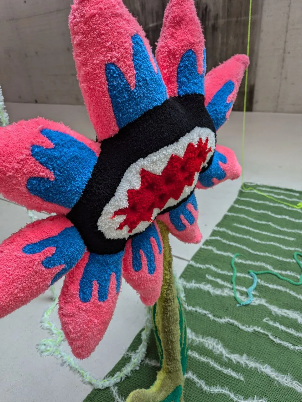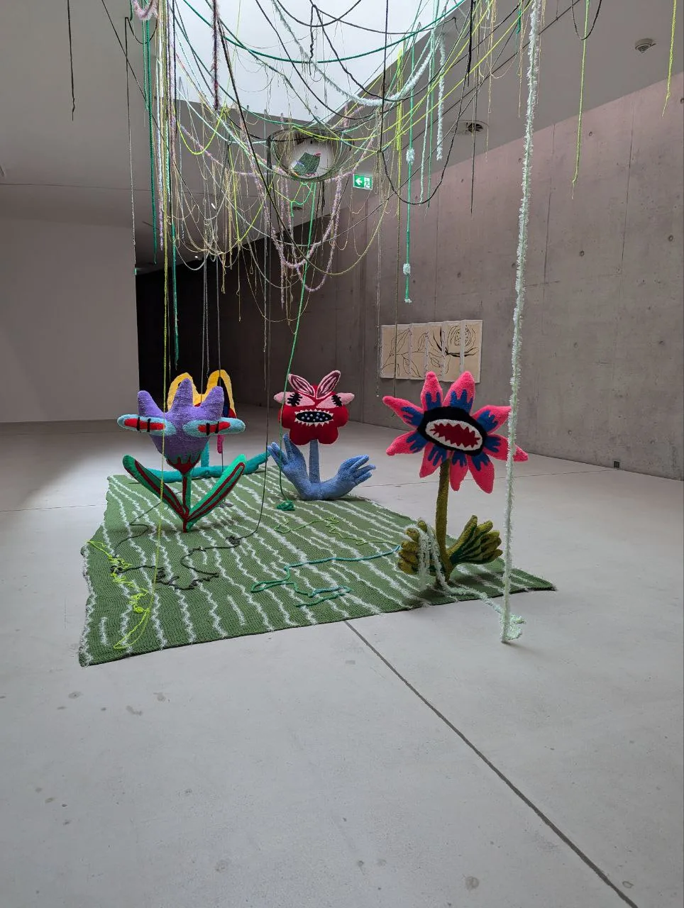 Viki Berg работает в ковровой технике. На стене висит её гербарий — с цветами и цветами-монстрами. Мотив цветов из украинской народной живописи, мягкие петли нитей, и там же — тревожные линии, глаза, зубы, щупальца. В центре зала под световым люком вырастает инсталляция «Сад монстров». Сад похож на сон между сказкой и кошмаром. Монстры вроде и страшные, но они же вязаные, ковровые, домашние. Есть ощущение бытия в теплом, в уютном, внутри, в коконе. Но в то же время в гротескном, неправильном, несоразмерном мире. Чарующая шаткость этих двух оптик.