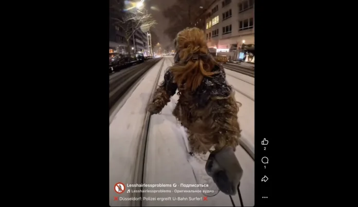 Забавный трюк в Дюссельдорфе может обернуться для его автора серьёзными последствиями. Как сообщает RP Online, полиция начала расследование после того, как в сети появилось видео: человек в костюме Чубакки катается на сноуборде по улице Graf-Adolf-Straße, зацепившись за трамвай. Мужчину подозревают во вмешательстве в дорожное движение.