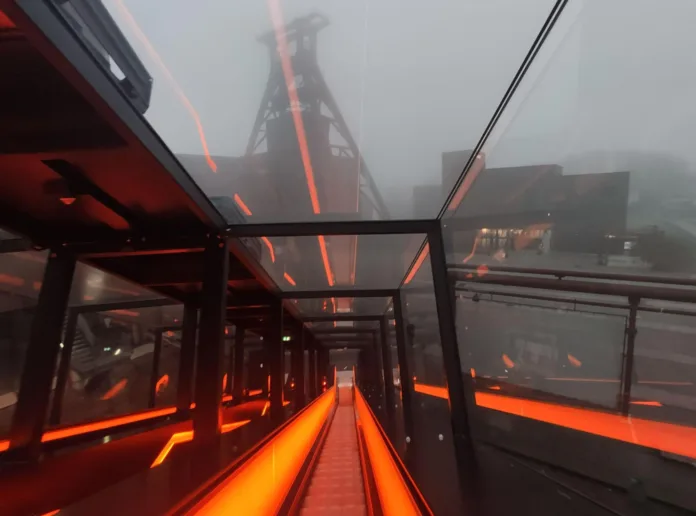 К кассам нас возносит не просто эскалатор, а самый большой открытый эскалатор в Германии. Его подсветили оранжевыми линиями по всему периметру — и в этом моменте неожиданно считывается символизм «союза огня и угля». В темноте это выглядит особенно эпично, поэтому вход в музей вам, как и мне, наверняка запомнится.